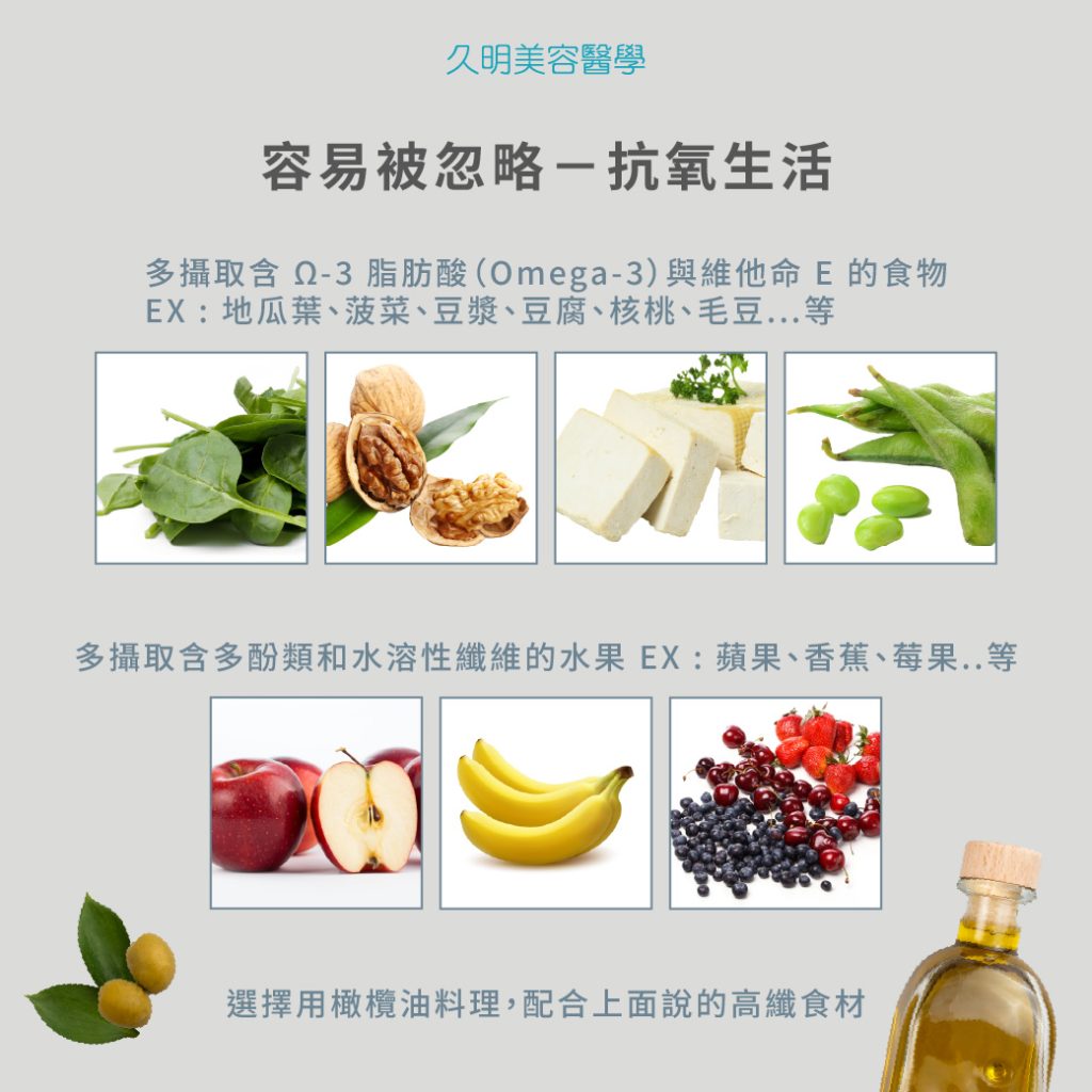 1. 多攝取含 Ω-3 脂肪酸(Omega-3)與維他命 E 的食物,例如:地瓜葉、菠菜、豆漿、豆腐、核桃、毛豆…等,對抗氧化很有幫助。