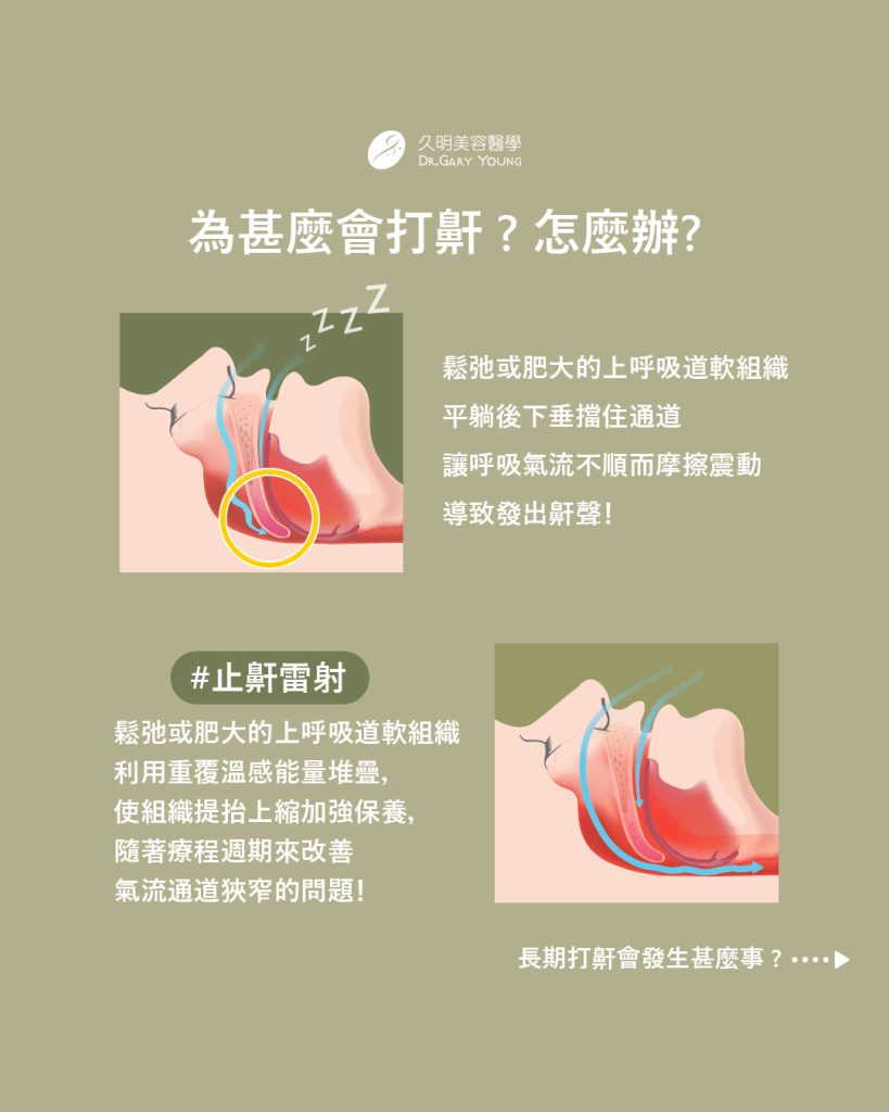 若排除鼻過敏/扁桃腺肥大/肥胖仍有打呼,可以評估讓呼吸道軟組織提抬上縮 的「止鼾雷射」喔!溫感能量重複疊加,讓懸壅垂組織得到加強保養,隨療程週期改善氣流通道狹窄的問題👍