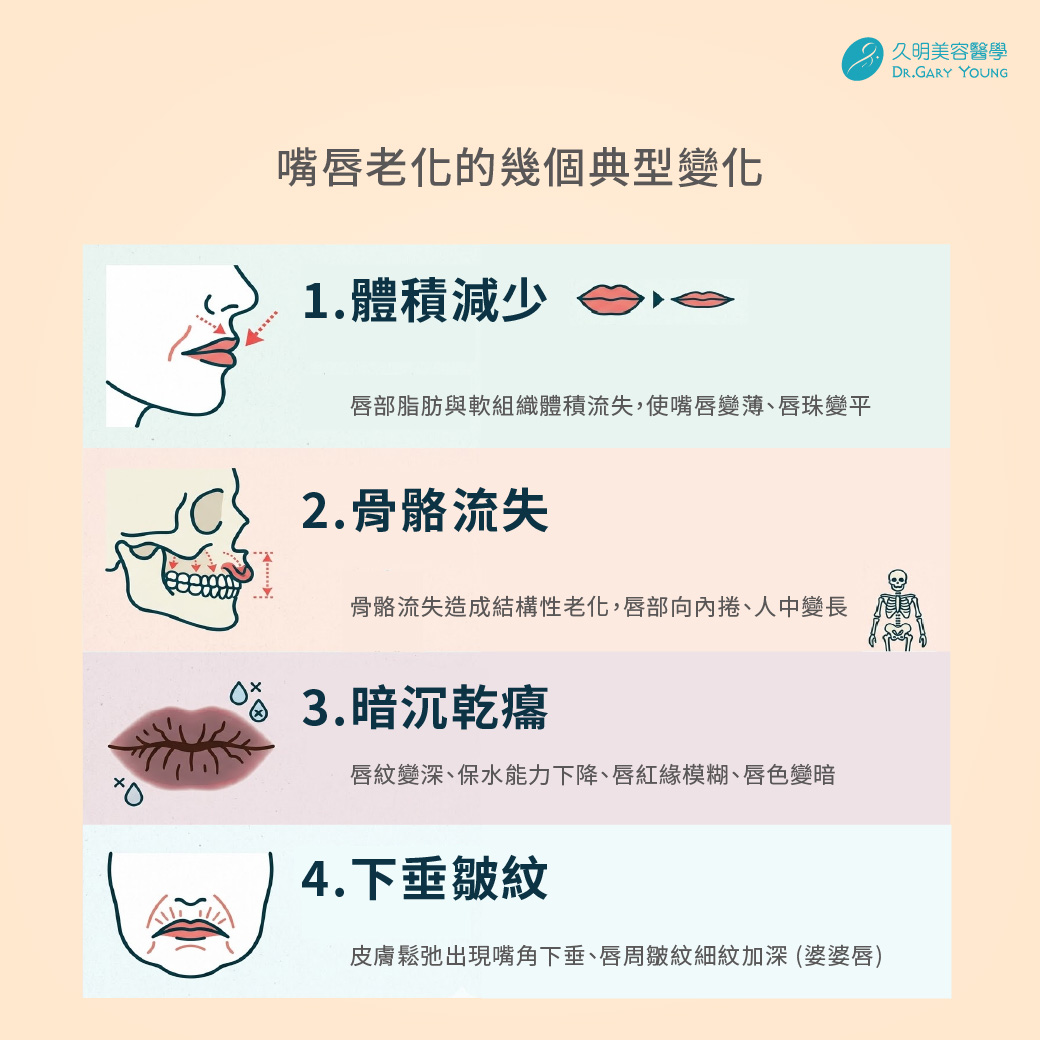從解剖與老化機轉來看,嘴唇會出現幾個典型變化: