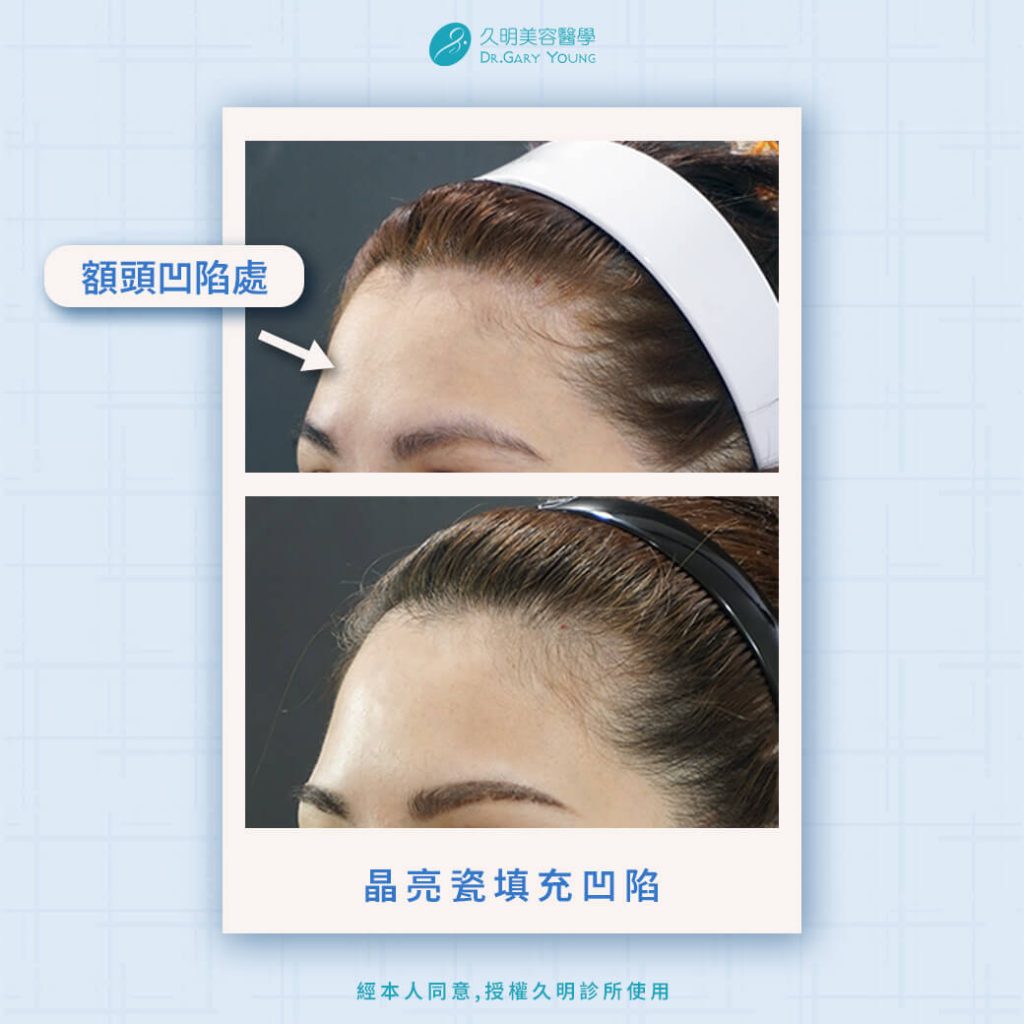 美國一些針對前額施打晶亮瓷的研究顯示,它可以明顯改善額頭凹陷與細紋,且滿意度及功能安全性也高。