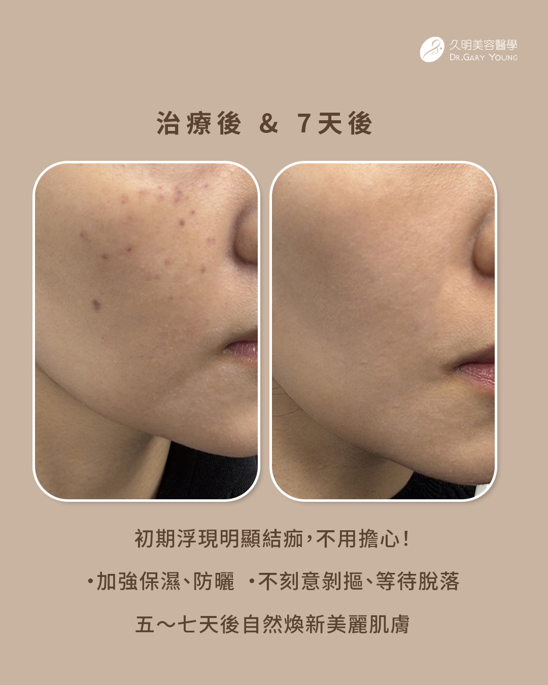和治療目標有蠻大的關係 ( 治療目標決定了結痂程度 )。如果是針對表淺色素斑 ( 例如部分雀斑、曬斑、老人斑、褐色斑點 ) 做比較聚焦的治療,表面較容易出現細小痂皮;如果是偏重淨膚、膚色提亮,或針對毛孔、痘疤,可能只有泛紅、乾、粗粗的,不一定會有明顯一顆一顆的痂。