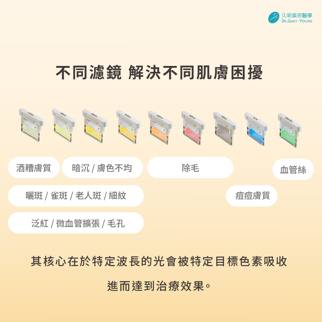 M22彩衝光系統由Lumenis公司開發,屬於強力脈衝光 IPL ( Intense Pulsed Light ),IPL並非單一波長雷射,而是涵蓋多波段光譜的光能設備,透過「濾片」選擇特定波長區間,對應不同的皮膚問題。