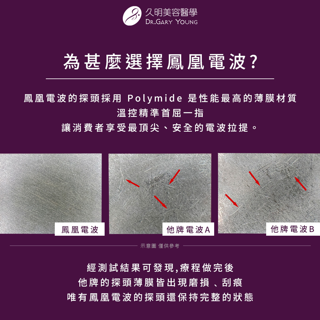 目前全世界的類絕緣材質性能,當以 Polymide 為佼佼者,它作為鳳凰電波探頭的薄膜介質,讓緊膚拉皮穩定安全更好!除了溫控穩定更高,更同時兼具輕薄穿透性、將有效治療溫度傳遞發揮到極致。