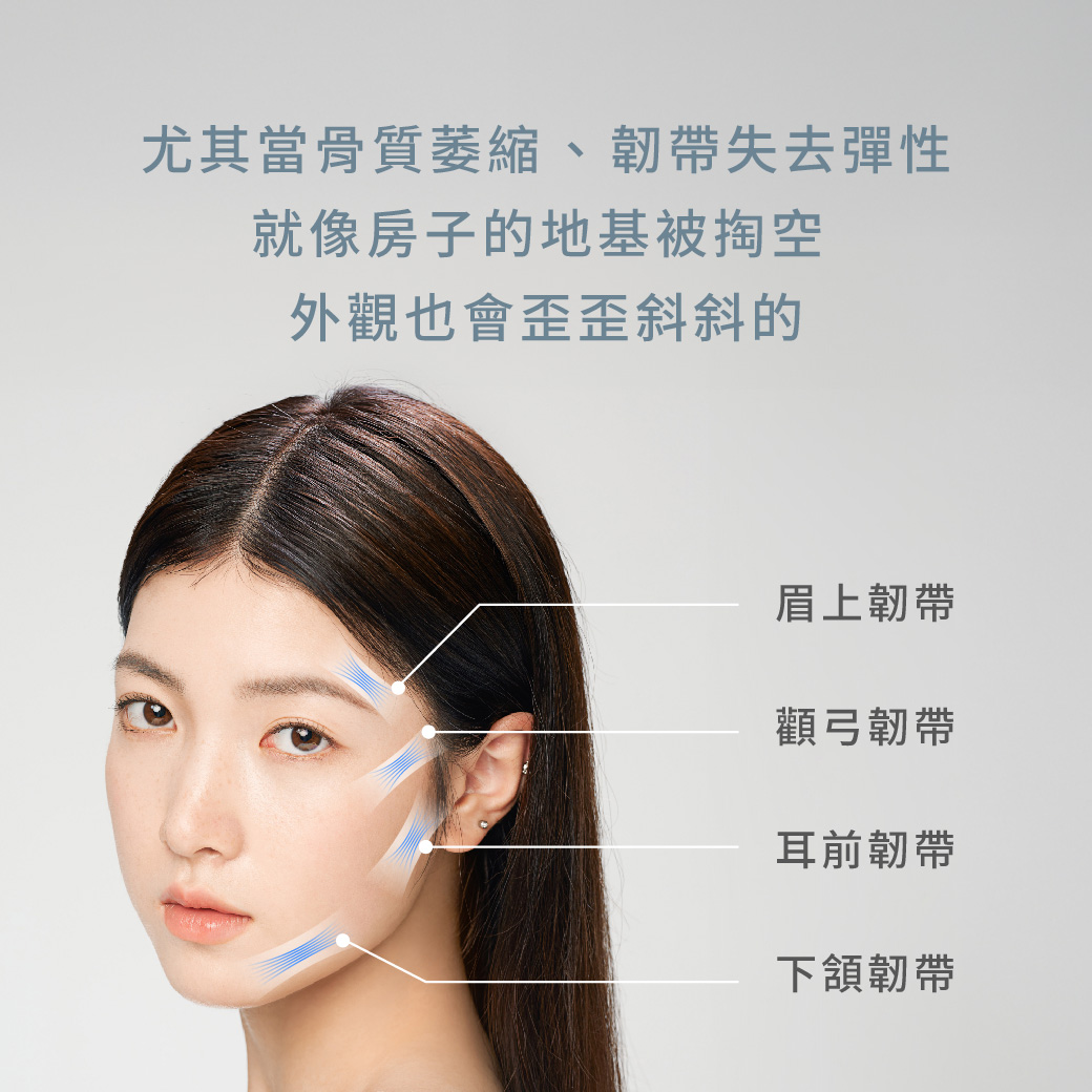 另外,當「顴骨」、「眉弓」、「下顎骨」流失越多,鬆垮下垂就越明顯!而對應著這些位置,也是正是韌帶(包含眉上、顴弓、耳前、下頷等等)所在之處;其實「韌帶」本身也會鬆弛、失去彈性喔!韌帶鬆弛就像生銹歪斜的釘子,導致房屋牆外的招牌鬆動擺盪,看起來老舊又不美觀。