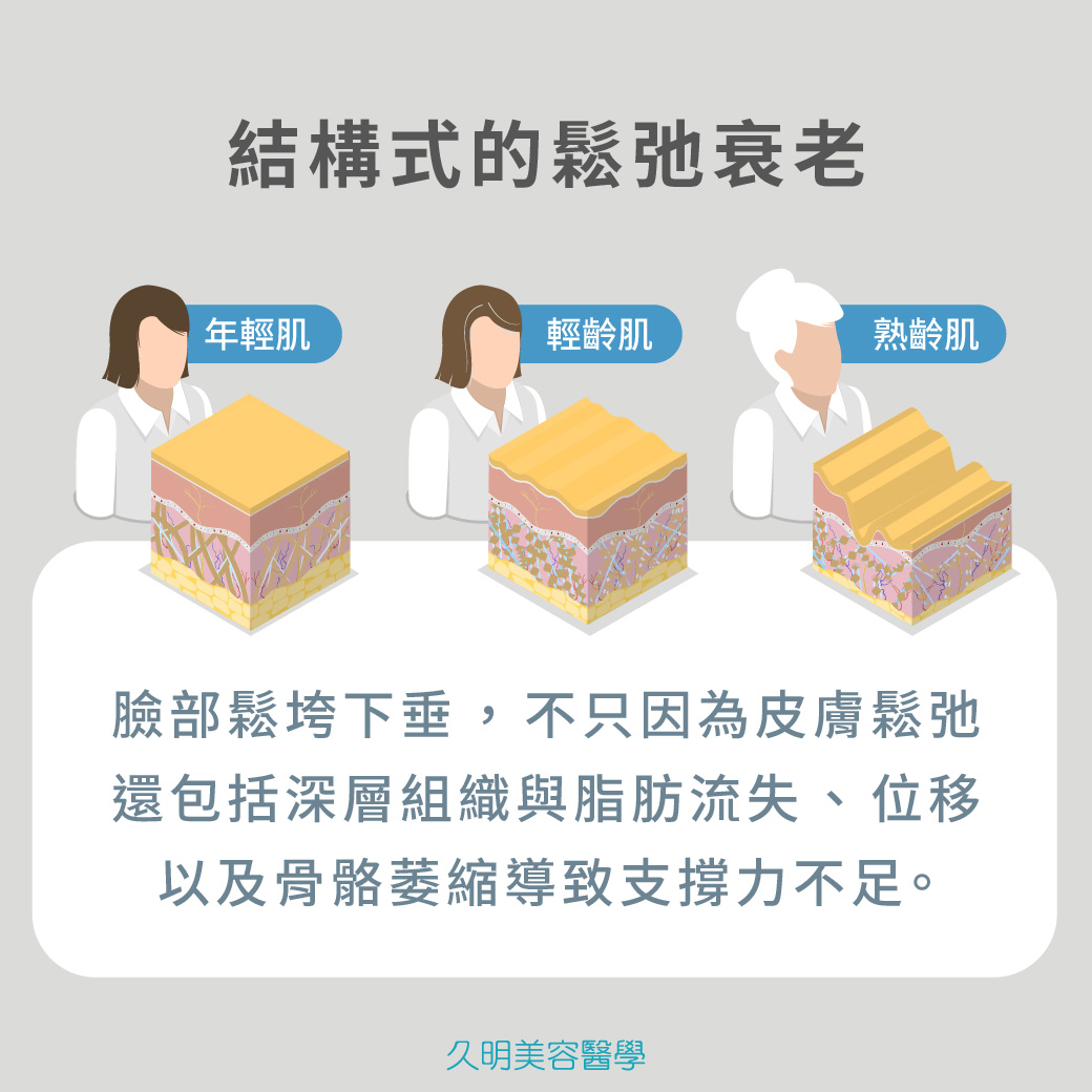 臉蛋鬆垮下垂的原因,除了皮膚變鬆弛外,還有「深層組織」與「深層脂肪」流失與位移所導致,另外還有骨頭/骨架萎縮後支撐力不足緣故。
