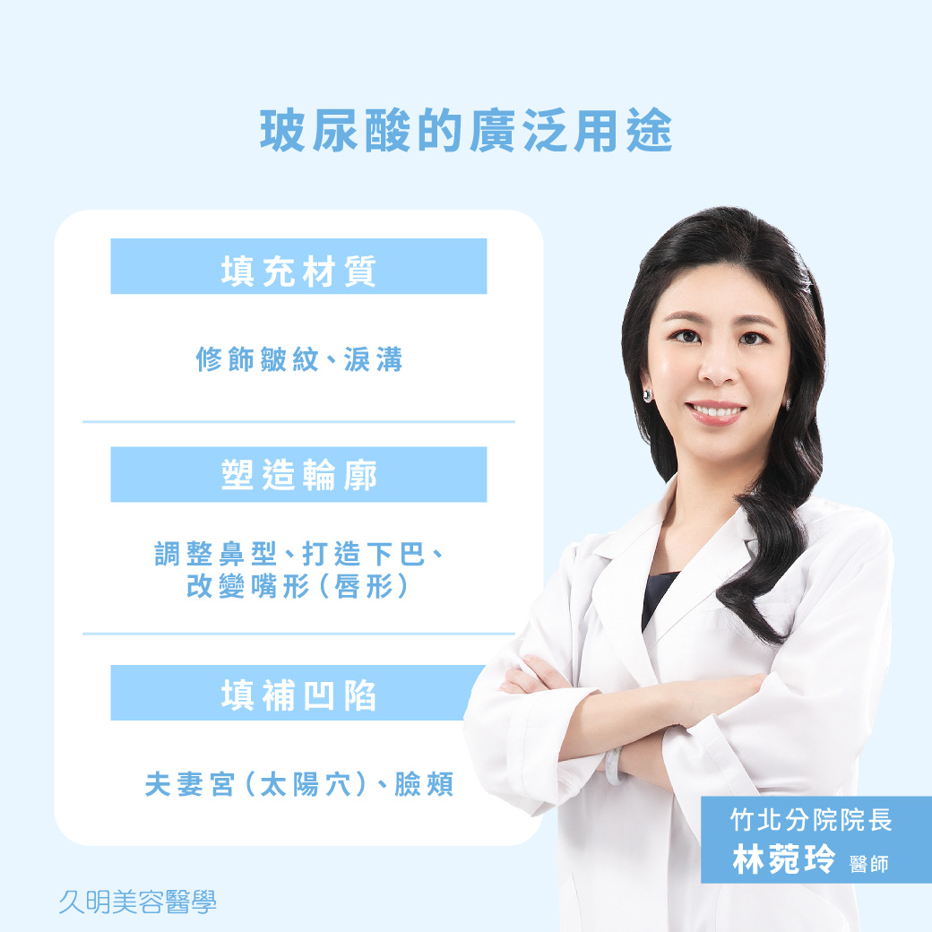 而除了以上我們比較知道的部位,玻尿酸也可以幫助改善五官的協調美,甚至做到眉尾眼尾拉提喔!今天就由 久明診所竹北院區院長-林菀玲醫師 帶大家揭開更多關於「玻尿酸」的使用技巧。