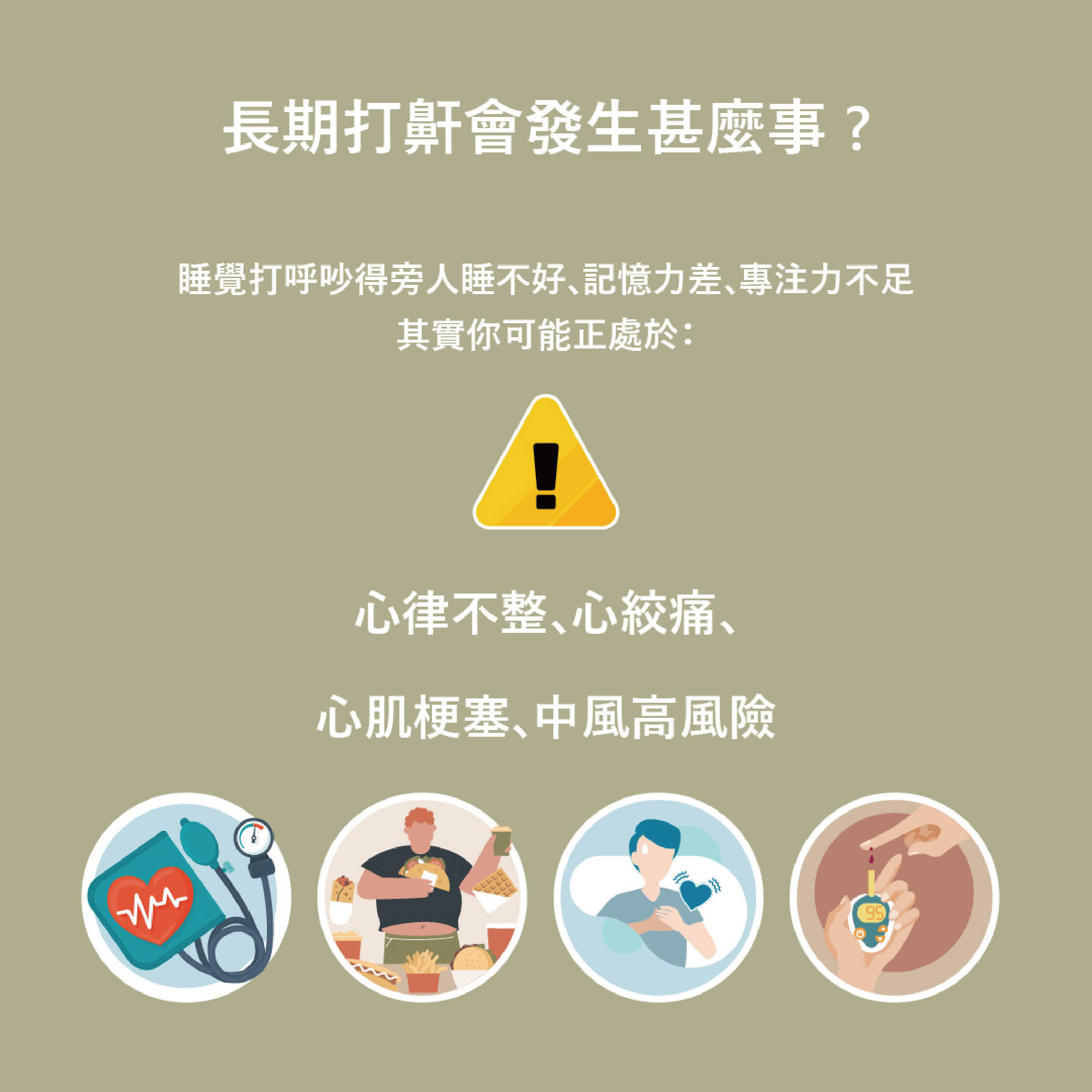 睡覺打呼吵到旁人睡不好、記憶力差、專注力不足,有可能其實你正處於:⚠睡眠呼吸中止⚠身體心肺含氧不足⚠呼吸氣道阻塞⚠代謝症候群、身材中廣胖胖⚠心律血管問題高風險