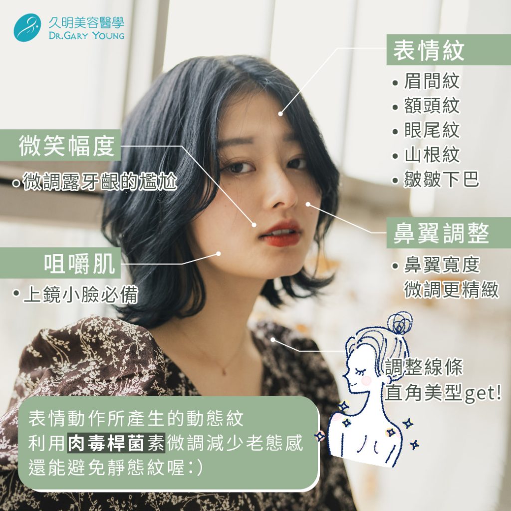 生活中偶爾會遇到各種壓力與挑戰,一不小心就會讓「動態皺紋」跑出來,這時候就可以評估以「肉毒桿菌素」微調一下,定期調整表局部的表情皺紋,也可以進一步避免靜態型皺紋形成/加深喔! 更可以搭配「潔比爾(航太亮肌)」做好保濕調理,輕鬆維持年輕水嫩~