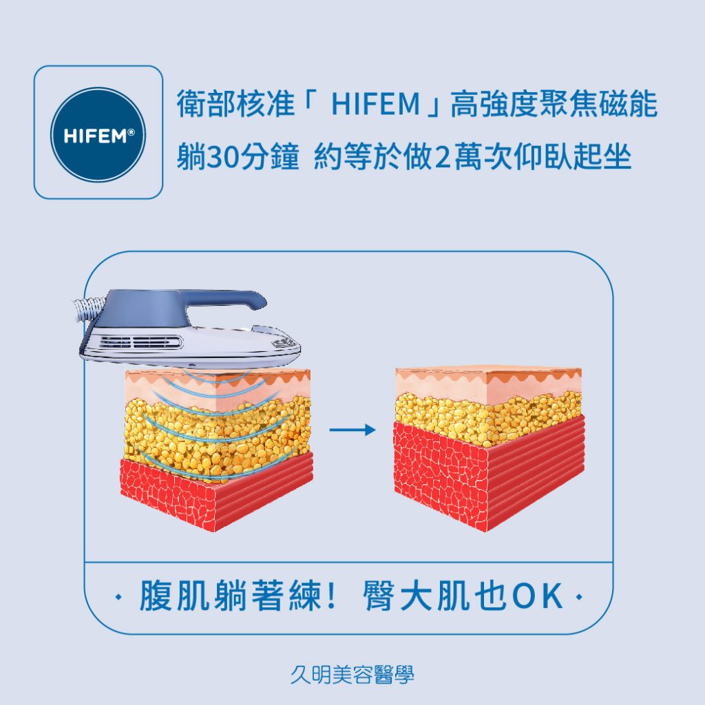 通過衛部核准適應症、幫助肌肉緊實收縮,躺著就能鍛練腹肌、還能練臀肌,可諮詢評估腹部與臀部各區核心肌肉鍛練,例如腹內外斜肌、腹直肌,臀大肌..等。