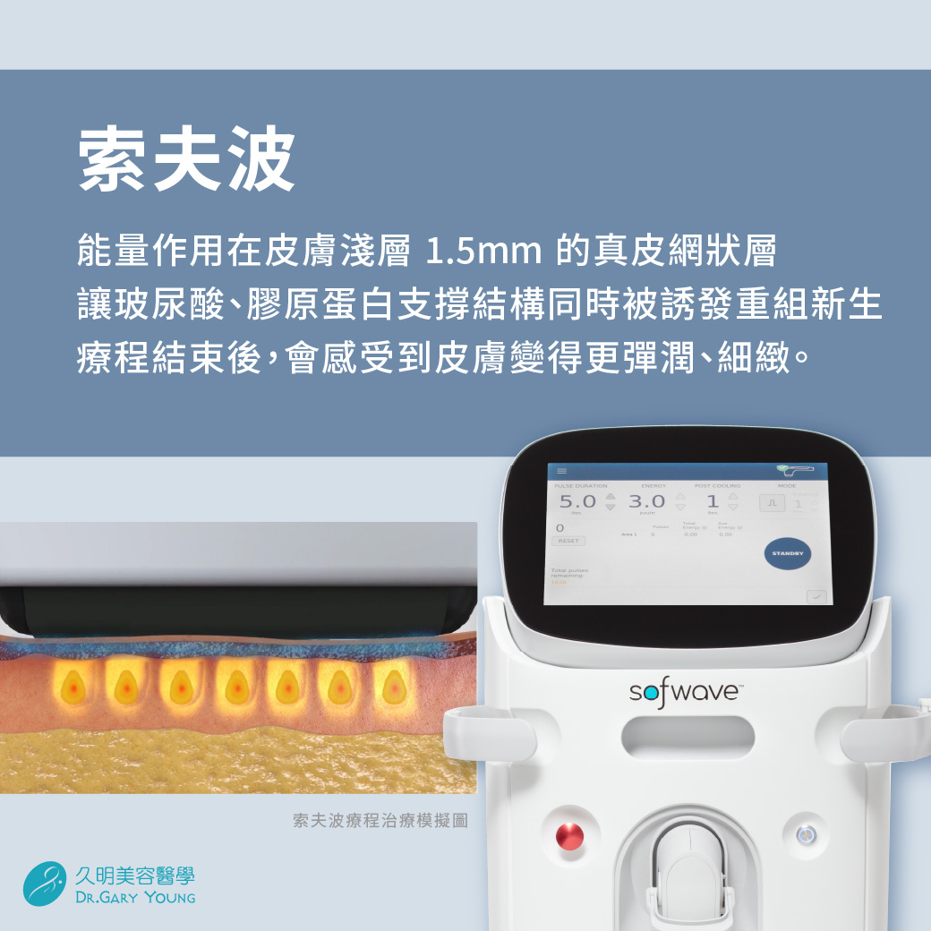 「索夫波」的能量作用深度是在淺層 1.5 mm ,正好是真皮網狀層,讓玻尿酸、膠原蛋白支撐結構同時被誘發重組新生,許多人做完當下就能感受到「皮膚變繃變Q!變亮!」,更有非常多的回饋是「隔天上妝超級服貼!」、「粉底用量只需要以前的一半!」。