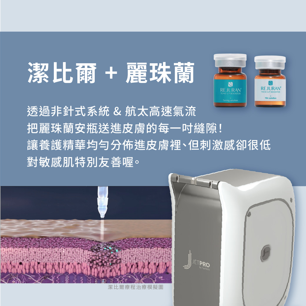 透過定期密集的 「潔比爾麗珠蘭」 ,可以好好地協助皮膚修復、適應環境氣候,噴射導入的方式,可以在日常做到毛孔淡化、改善色素沉澱,瞬間提升皮膚飽水度並提亮膚色,對於膚況反覆的人 ( 敏感肌 ) 也特別友善。