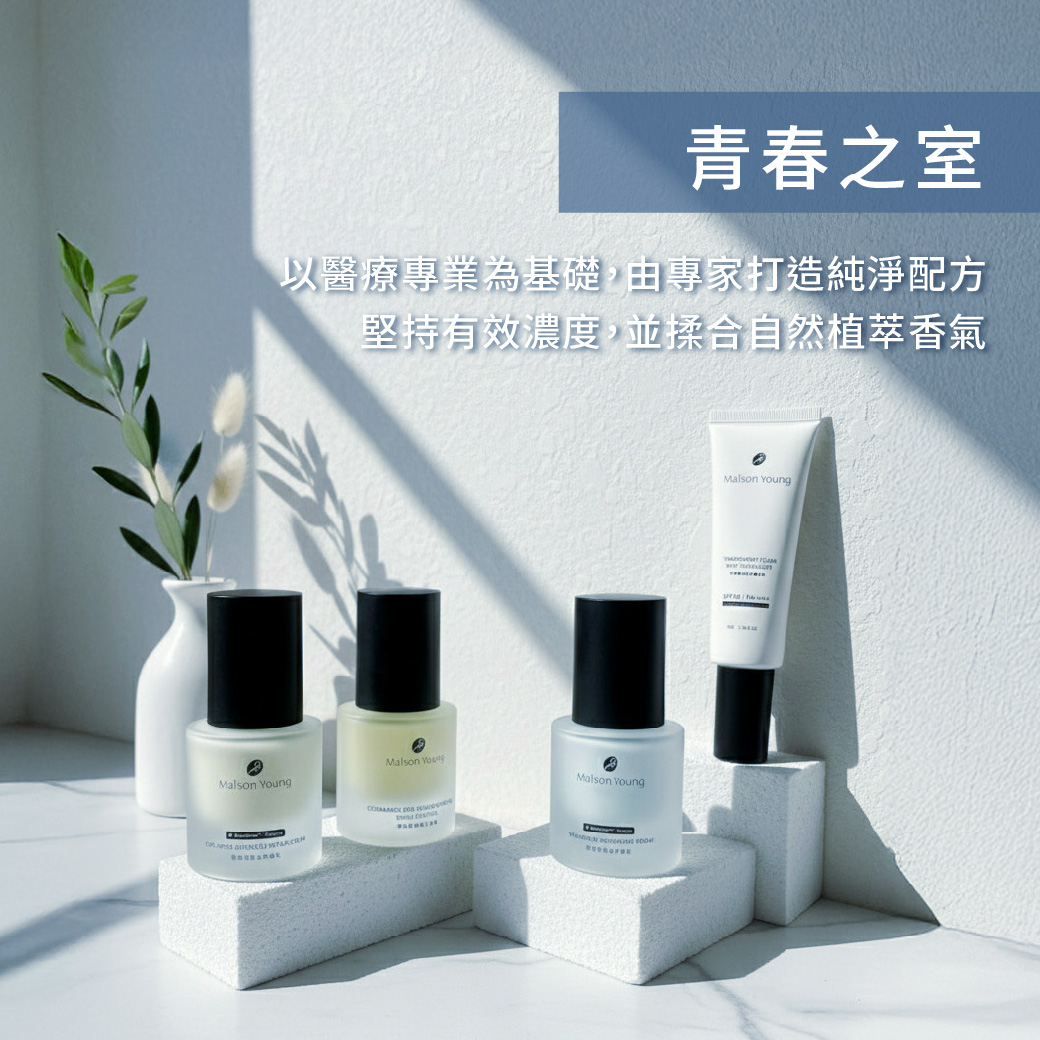 「青春之室」以醫療專業為基礎,由專家打造純淨配方,堅持有效濃度,並以自然植萃香氣舒緩疲憊日常,陪伴您的肌膚回到最穩定的狀態。 以預防為本,回歸透明與單純,享受簡約無負擔的頂尖保養生活。
