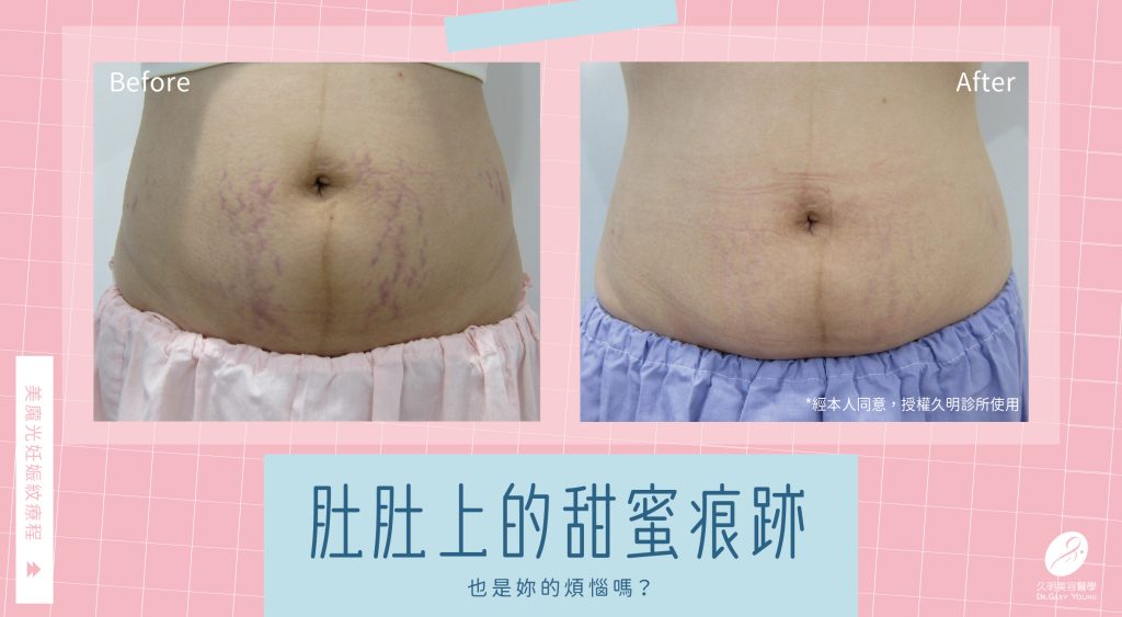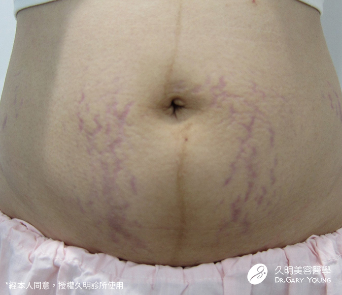 我是曉媛~身為七年級的輕熟水媽咪,會走進久明診所諮詢,主要是為了我肚子上的甜蜜之吻:「 女壬 女辰 紅 紋 」。雖然我就有特別注意,洗澡後一定擦上滋養油,加強按摩整個腹部,就是希望「 女壬 女辰 糹文 」不要找上我~