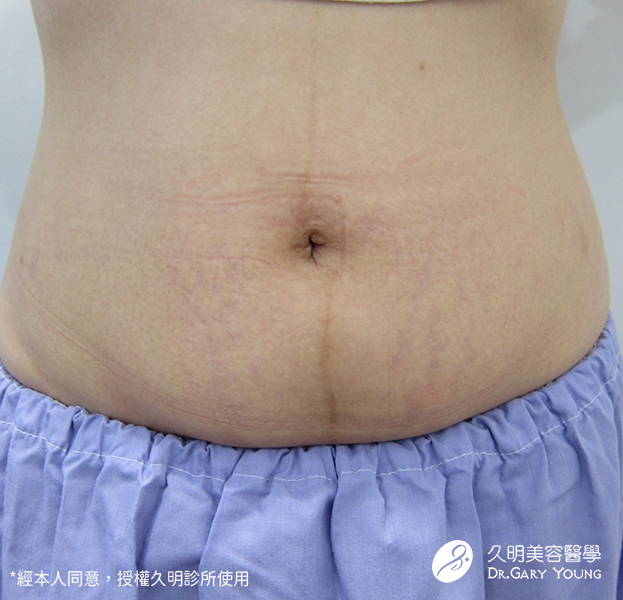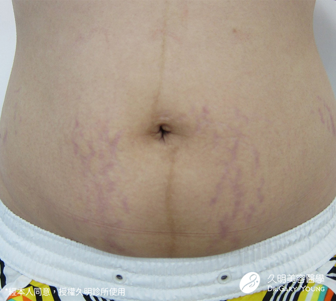 醫師評估,我的「 女壬 女辰 糹文 」是隨著血管增生,還有彈力纖維逐漸變少,肚臍左右兩側開始出現這樣不規則的閃電狀紫紅色「初期紅紋」!他建議我把握時間加以治療,以免因為時間拖長、可能轉為下一階段的白色疤痕、也就是「白紋」,那白色的「 女壬 女辰 糹文 」屬於萎縮後帶有皺褶的疤痕,處理起來會更具難度,效果也較難以預期。