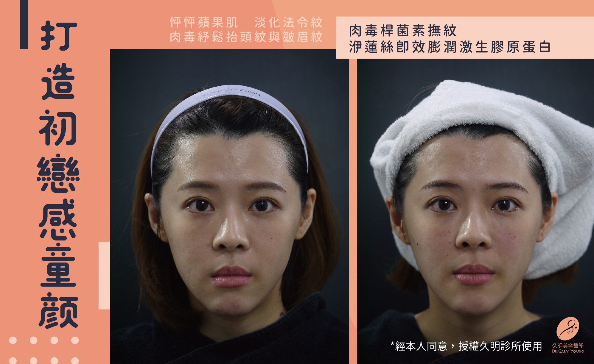 噹啦~ 術後當時拍攝的照片就這樣公開啦,我自己感覺是洢蓮絲打完約一週膚質開始變得很好,肉毒桿菌素治療約過一週開始作用喔,不管你對自己門面極度要求、還是有加分就好,建議你,別對著鏡子悶頭瞎猜或苦苦地爬文,推薦你走一趙久明診所,給經驗豐富的醫師看看,從專業人士的角度給你不一樣的觀點,或許你會豁然開朗喔。