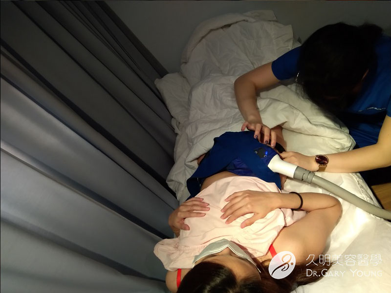 經過兩三次的調整之後,護理技師在液晶面板上設定好正式的低溫負壓吸引模式,珮珮就在舒適的燈光下,閉目養神休息等待,迎接下一個部位的負壓吸引治療囉!
