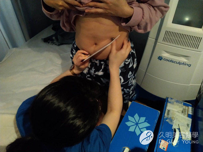 諮詢結束之後,珮珮換上了可愛的粉色系平口美容服,原廠護理技師就可以為珮珮進行腹部及腿部的測量與畫記了。畫記完成後,就先從「腹部」開始施以治療囉。珮珮躺下後,我們為她擦拭清潔肌膚上的皮脂塵汙,並貼上具有隔離作用的「coolsculpting原廠抗凍凝膜」,以減緩低溫對皮膚的偒害
