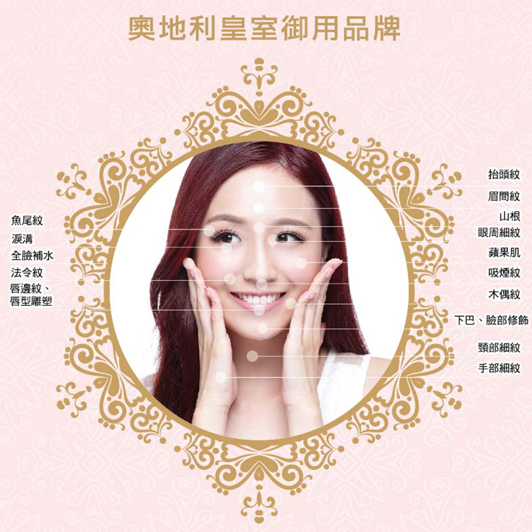 玻尿酸可評估修飾美化木偶紋、皺紋、疤痕、脖紋、淚溝凹陷、眼周細紋、臥蠶、雙唇、手背、耳珠耳垂、胸型。