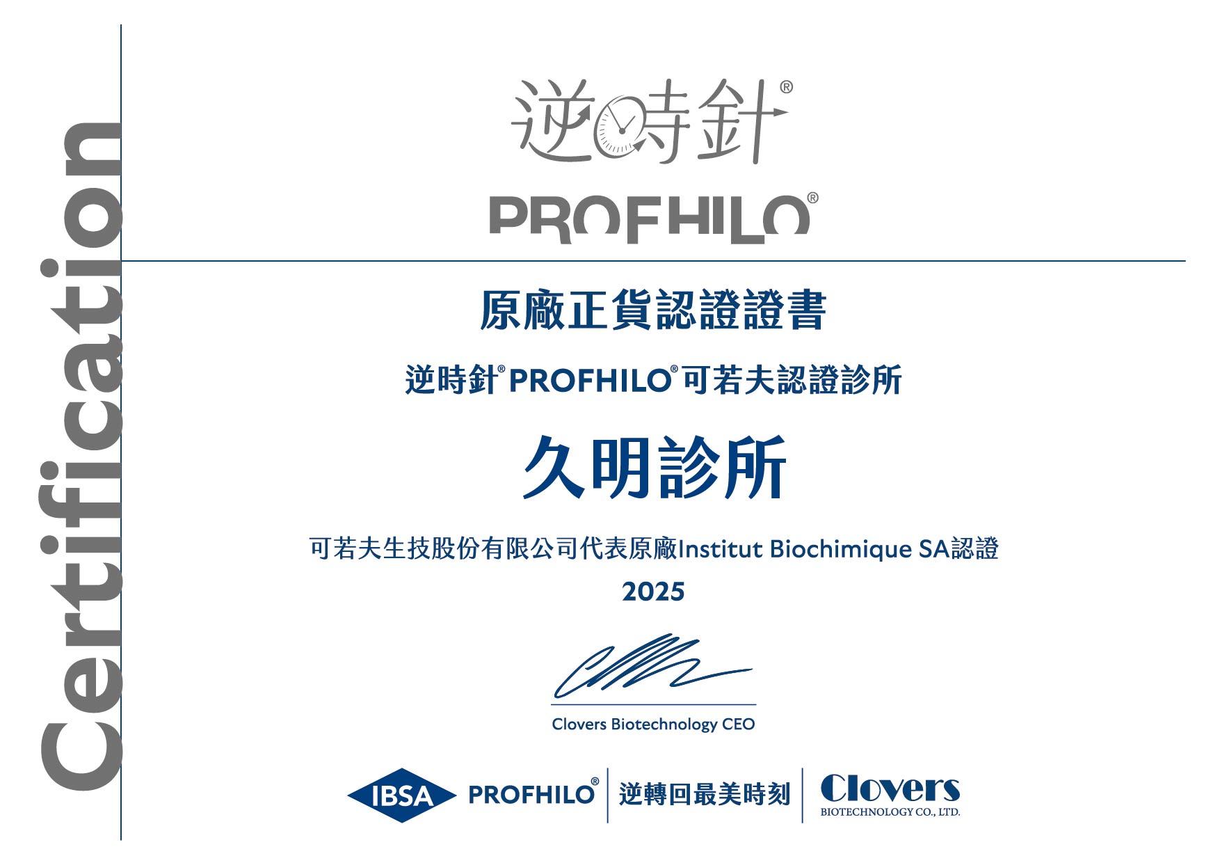 「逆時針 PROFHILO」有通過衛部核准適應症(第037968號,用於增加皮膚組織與皮膚彈性),預期用途為增加皮膚組織與皮膚彈性,玻尿酸可自然融合於皮膚組織中,協助重建肌膚水分平衡。