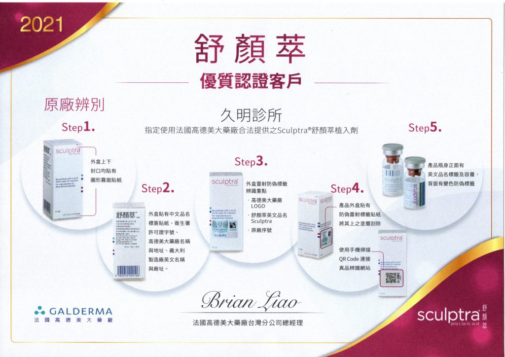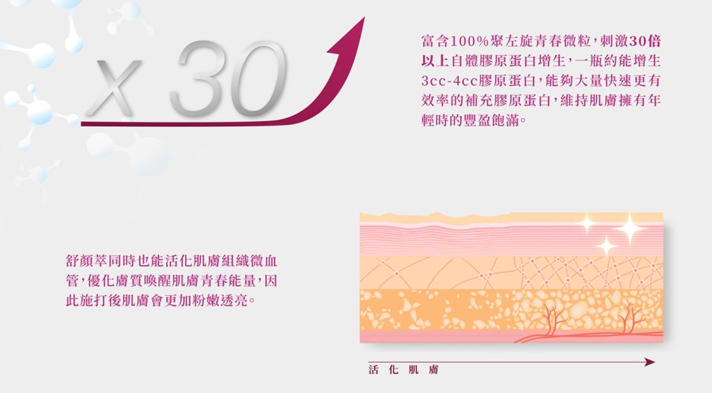 舒顏萃植入劑( 又稱為 : 4D童妍針 )含有聚左旋乳酸(PLLA)微粒,經衛部核准認,注入真皮層後促進膠原蛋白新生,調整臉部或手部等局部皺褶、皺紋,或填入凹陷處、改善鬆弛。保養後的四至六週漸進提亮膚色、撐起鬆弛皺紋。