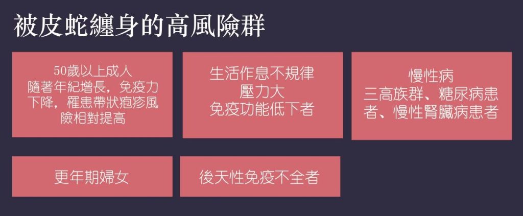 - 50歲以上成人:隨著年紀增長,免疫力下降,罹患帶狀皰疹風險相對提高